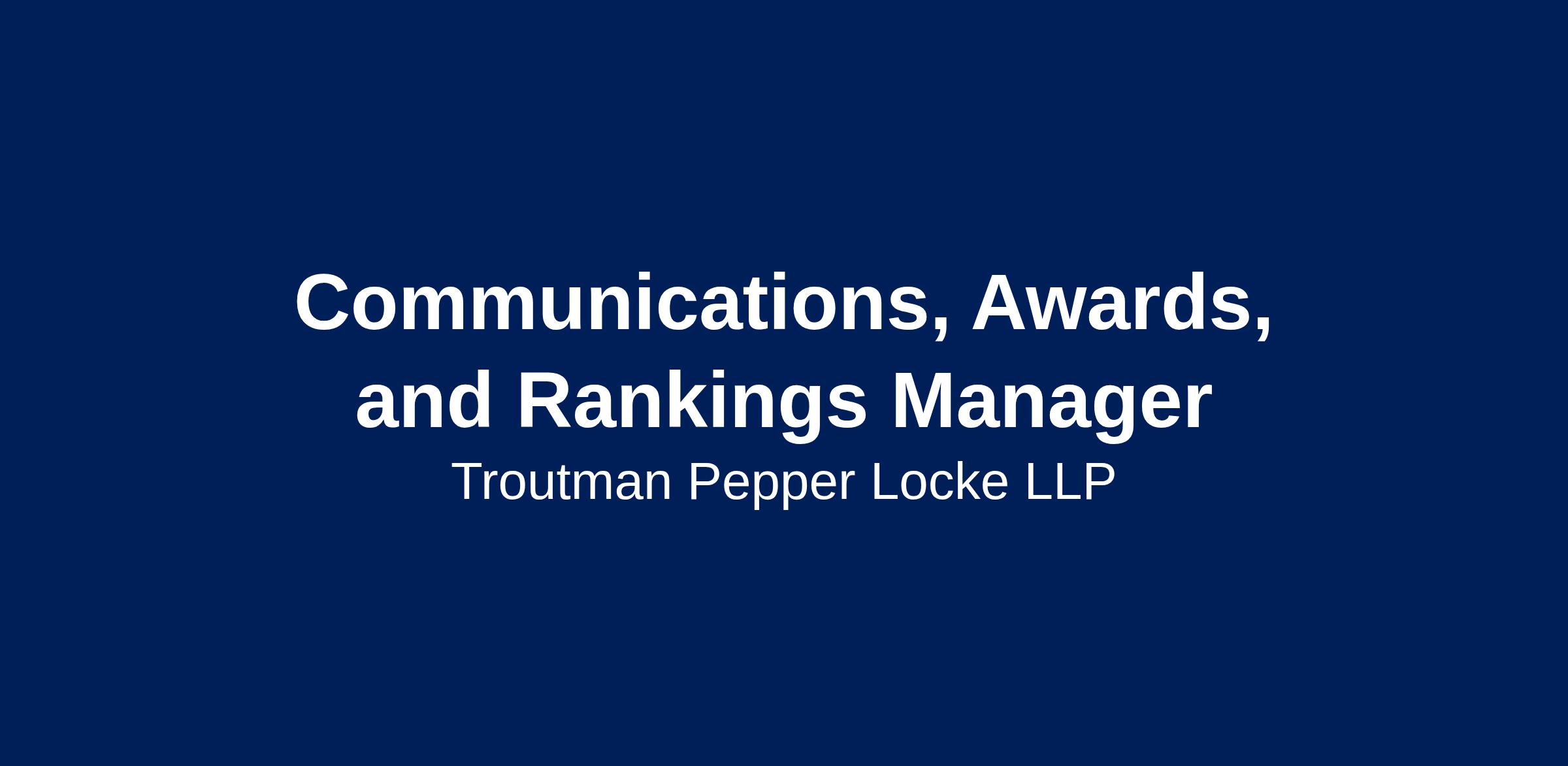 We are always seeking talented, motivated, growth-minded, and creative individuals. Our firm is committed to providing employee support and advancement, while embracing inclusion and innovation as keys to a stronger future. We invite you to explore the position below and to submit your application to join our team! The Communications Manager, Awards and Rankings, plays an integral role spearheading all aspects of the firm’s rankings and recognitions in key legal directories and award programs. This position works closely with firm leadership, lawyers, the business development team, and other internal constituents managing Troutman Pepper Locke’s directories and awards processes. The Communications Manager, Awards and Rankings is responsible for developing awards and rankings strategies, creating award-winning submissions, elevating the firm’s profile in the market, and managing other communications projects, as needed. Essential Duties and Responsibilities Lead and manage the firm’s comprehensive submission strategy for business rankings, surveys, and awards. Proactively provide strategic recommendations for existing or new business rankings, surveys, and awards the firm should pursue in line with its strategy. Create and manage a legal directory and awards calendar that sets timelines and deadlines. Assist with the firm’s global legal directories submissions process, including Chambers and Legal 500, among others. Draft and edit nominations. Lead the management of the submissions process and ensure adherence to deadlines, as well as the quality of the submissions. Analyze, research, and provide guidance on brand-elevating opportunities and best practices around nominations and submissions, including the use of generative AI. In charge of the collection of data and maintaining internal databases to reflect the most up-to-date firm rankings and recognitions. Knowledge, Skills, and Abilities Excellent oral, writing, editing, researching, and project management skills. Strong attention to detail and organizational skills. Ability to distill complex concepts into compelling and persuasive content. Ability to take initiative and independently manage and prioritize a heavy workload, and to perform in a fast-paced environment, meeting frequent deadlines. Effective interview skills. Strong Microsoft skills, including Word, Excel, and PowerPoint. Experience using generative AI tools and interest in generative engine optimization strategies. Client-service oriented. Ability to work collaboratively with colleagues at all levels of the firm. Strong analytical and problem-solving skills. Flexibility to adapt to quickly changing priorities. Education and/or Experience Bachelor’s degree with a specialization in communications, English, or an equivalent field; or any combination of training, education and experience that demonstrates the ability to perform the duties of the position. Minimum of five (5) years of experience writing, editing, and proofreading in communications, journalism, publishing, public relations, marketing, or related field in an agency, law firm, or professional services firm. Experience working with LexTrack beneficial. #LI-Hybrid The Firm will comply with any applicable city or state workplace mandates in effect in regards to Covid-19. This position description is intended to describe the general content of and requirements for the performance of the job. The statements contained in the position description are not necessarily all-inclusive and additional duties and responsibilities may be assigned as determined by business needs. This position description does not constitute a written or implied contract of employment. Reasonable accommodations may be made to enable individuals with disabilities to perform the essential functions. By applying for this position, you agree and understand that Troutman Pepper Locke will process your Personal Information pursuant to the terms of our Worker and Applicant Global Privacy Notice. If you have questions about our data handling practices, or you are a resident of California, the United Kingdom, or the European Union and wish to exercise your privacy rights, please contact us at privacy@troutman.com. Equal Employment Opportunity Troutman Pepper Locke adheres to a policy of equal opportunity and will make all employment decisions, which include hiring, promotion, transfer, demotion, evaluation, compensation and separation, without regard to race, color, religion, sex, age, sexual orientation, gender identity or expression, national origin, pregnancy, citizenship, disability, genetic information, marital or armed forces status and any other classification as protected by law. Compensation is dependent on several factors, such as position, location, education, training, and/or experience. Hiring Salary Range: $100,000.00 - $120,000.00 About Us Your experience is our difference. We aim to make a tangible and lasting difference for you and your business. As a client of our firm, you can expect us to be ahead of the curve in your industry, start closer to the right answer on your issue, and create more value. What drives you, drives us. Troutman Pepper Locke helps clients solve complex legal challenges and achieve their business goals in an ever-changing global economy. As a firm of more than 1,600 attorneys in 35 offices in the U.S., UK, and EU, including the 10 largest U.S. legal markets, we serve clients ranging from multinational companies to new market entrants across all major industry sectors, and offer differentiated experience in energy, financial services, health care and life sciences, insurance and reinsurance, private equity, and real estate. We put clients first. This service ethic manifests itself in everything we do, including through Troutman Plus, our market-leading client value program. Through Troutman Plus, we collaborate with clients to understand their unique needs and deliver customized solutions that add real 
