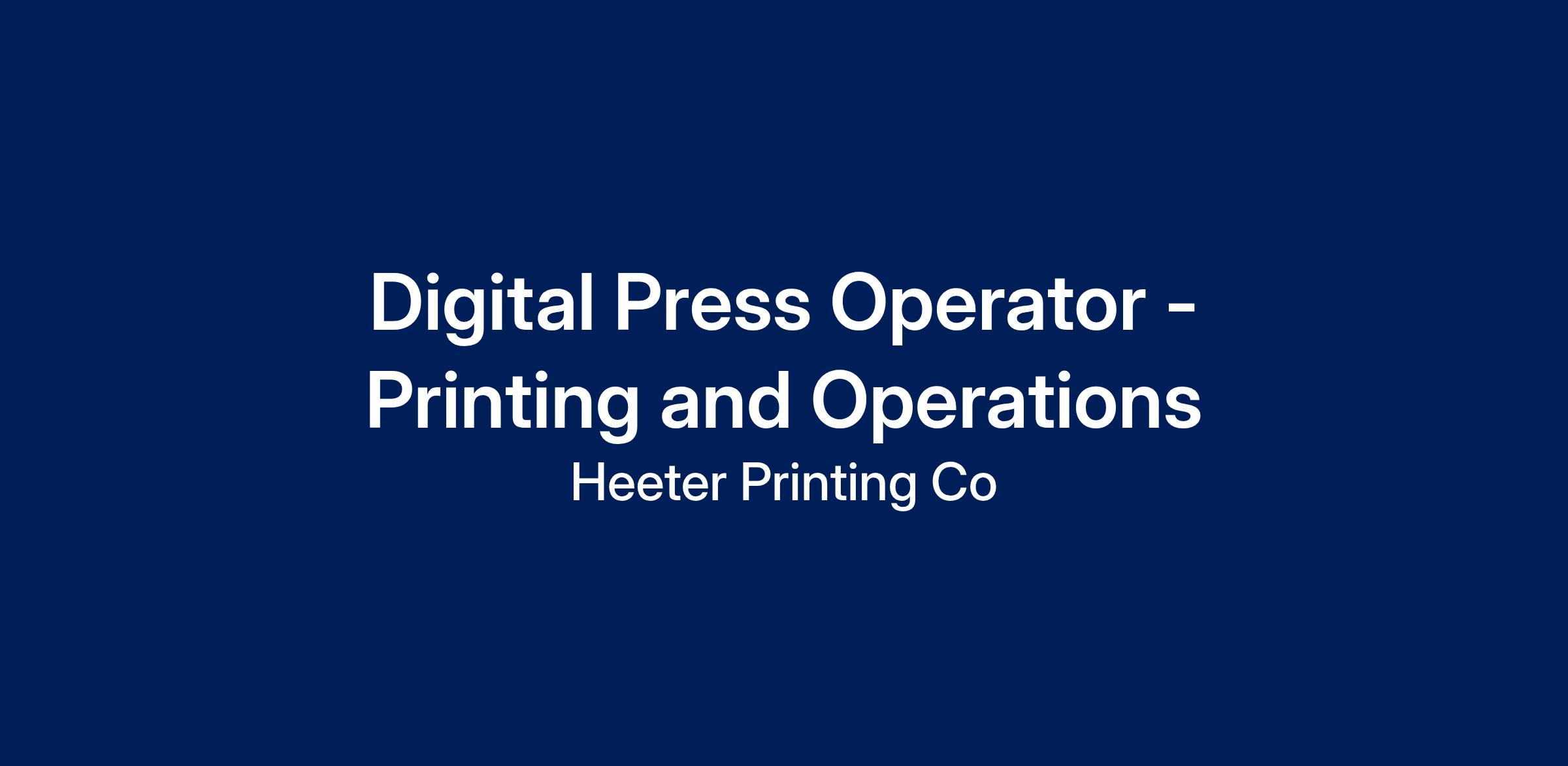 Heeter is hiring for a 2nd shift (3 pm – 11 pm) Digital Press Operator to run the Digital Printing presses - Ricoh VC70000, Ricoh 9210 and Ricoh Z75 - the most technically advanced machines in the Printing Industry. The Digital Print department is a very fast-paced machine and requires candidates with a high energy level.