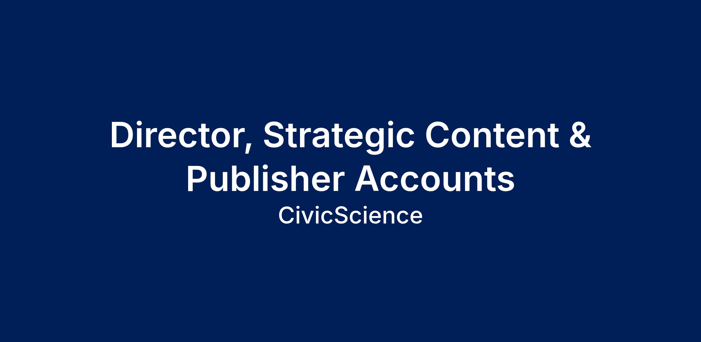 Every day, CivicScience gathers opinions from millions of consumers on thousands of topics that provide high-velocity insights to leading brands. If there's a question critical to the marketing strategy of the Global 2000, CivicScience has the data.OverviewCivicScience is seeking a Director, Strategic Content/Publisher Accounts to support the growth and maintenance of our content/publisher partner ecosystem. This is a mid-career opportunity for someone eager to leverage their account management experience and expand their business development skills.