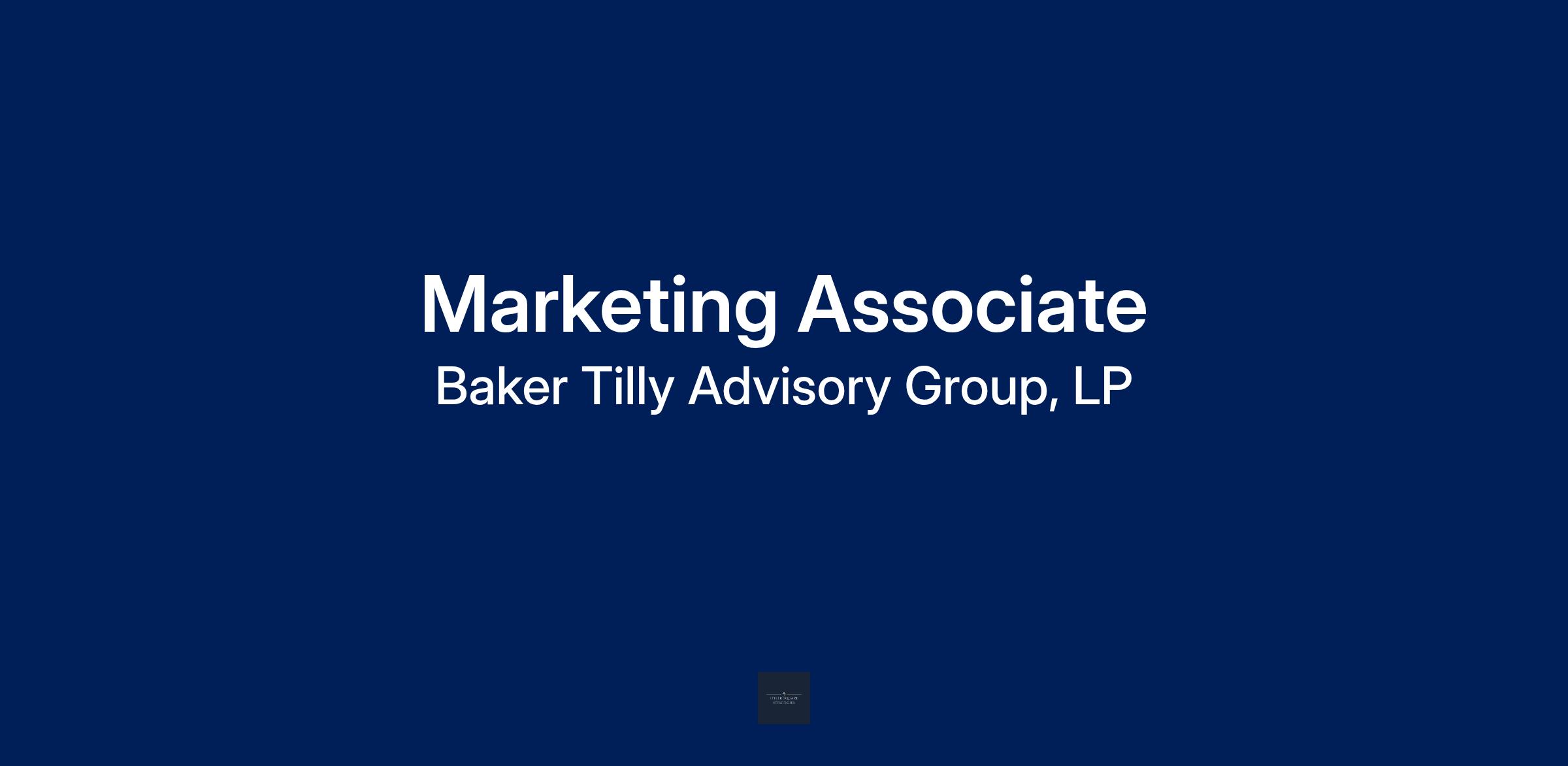 Overview Baker Tilly is a leading advisory, tax and assurance firm, providing clients with a genuine coast-to-coast and global advantage in major regions of the U.S. and in many of the world’s leading financial centers – New York, London, San Francisco, Los Angeles, Chicago and Boston. Baker Tilly Advisory Group, LP and Baker Tilly US, LLP (Baker Tilly) provide professional services through an alternative practice structure in accordance with the AICPA Code of Professional Conduct and applicable laws, regulations and professional standards. Baker Tilly US, LLP is a licensed independent CPA firm that provides attest services to its clients. Baker Tilly Advisory Group, LP and its subsidiary entities provide tax and business advisory services to their clients. Baker Tilly Advisory Group, LP and its subsidiary entities are not licensed CPA firms. Baker Tilly Advisory Group, LP and Baker Tilly US, LLP, trading as Baker Tilly, are independent members of Baker Tilly International, a worldwide network of independent accounting and business advisory firms in 141 territories, with 43,000 professionals and a combined worldwide revenue of $5.2 billion. Visit bakertilly.com or join the conversation on LinkedIn, Facebook and Instagram. Please discuss the work location status with your Baker Tilly talent acquisition professional to understand the requirements for an opportunity you are exploring. Baker Tilly is an equal opportunity/affirmative action employer. All qualified applicants will receive consideration for employment without regard to race, color, religion, sex, national origin, disability or protected veteran status, gender identity, sexual orientation, or any other legally protected basis, in accordance with applicable federal, state or local law. Any unsolicited resumes submitted through our website or to Baker Tilly Advisory Group, LP, employee e-mail accounts are considered property of Baker Tilly Advisory Group, LP, and are not subject to payment of agency fees. In order to be an authorized recruitment agency ("search firm") for Baker Tilly Advisory Group, LP, there must be a formal written agreement in place and the agency must be invited, by Baker Tilly's Talent Attraction team, to submit candidates for review via our applicant tracking system. Job Description: The Marketing Associate is primarily responsible for assisting with the planning and execution of marketing strategies and go-to-market campaigns. They will help execute a wide range of marketing tactics and initiatives, including in person and virtual events, sponsorships, engaging clients and prospects through content marketing, targeted demand generation campaigns, website landing pages, speaking engagements, thought leadership, webinars, e-mail marketing and internal communications. Projects will include assisting with online research, writing, editing, formatting presentations, and advertising Responsibilities: Assist with content and asset development and maintenance Provide writing and marketing assistance for a wide range of marketing strategy and content tactics that support the execution of go-to-market plans and other growth initiatives through activities such as: demand generation and nurturing campaigns, thought leadership, webinars, videos, sponsorships, special events, seminars, trade show exhibits, advertising and communications. Assist with the coordination and execution of marketing strategy and content activities to support go-to-market plans. Assist supervisor and other marketing colleagues in developing and maintaining up-to-date collateral, intranet and website pages, thought leadership, case studies and other content. Assist with public relations article placement opportunities. Assist with the generation of thought leadership and story ideas. Follow processes and best practices to enable the tracking of marketing return on investment. Collaborate with colleagues as appropriate to plan and execute work Utilize marketing department shared resources as appropriate to help execute initiatives. Participate in planning, project-specific, and team meetings, as necessary. Ensure alignment with marketing strategy, positioning and messaging in industry, service or other content developed Ensure compliance with firm guidelines and brand standards. Assist with coordination and execution of go-to-market plans Provide assistance for a wide range of marketing tactics and revenue growth initiatives to help execute go-to-market plans such as: demand generation and nurturing campaigns, thought leadership, webinars, videos, sponsorships, special events, seminars, trade show exhibits, advertising and communications. Assist with public relations opportunities. Maintain up-to-date list of targeted industry or service-specific media contacts. Help generate thought leadership and story ideas, monitor competitive news and develop specialized strategies for communicating other events. Assist marketing team in maintaining current and up-to-date industry and service line marketing tools and templates. Follow processes and best practices to enable the tracking of marketing return on investment. Collaborate with colleagues as appropriate to plan and execute work. Utilize marketing department shared resources as appropriate to help execute initiatives. Participate in planning, project-specific, and team meetings, as necessary. Ensure compliance with firm guidelines and brand standards. Perform research and other marketing support as needed Assist in conducting online research of specific thought leadership topics and business needs/issues Use internal and external research as needed when executing work Participate in marketing best practice task forces and special projects Maintain and expand knowledge base in a variety of marketing areas Continuously expand knowledge base in assigned specialized industries, services and/or geographic markets. Integrate new knowledge, skills, and best practices into daily work and share with collea