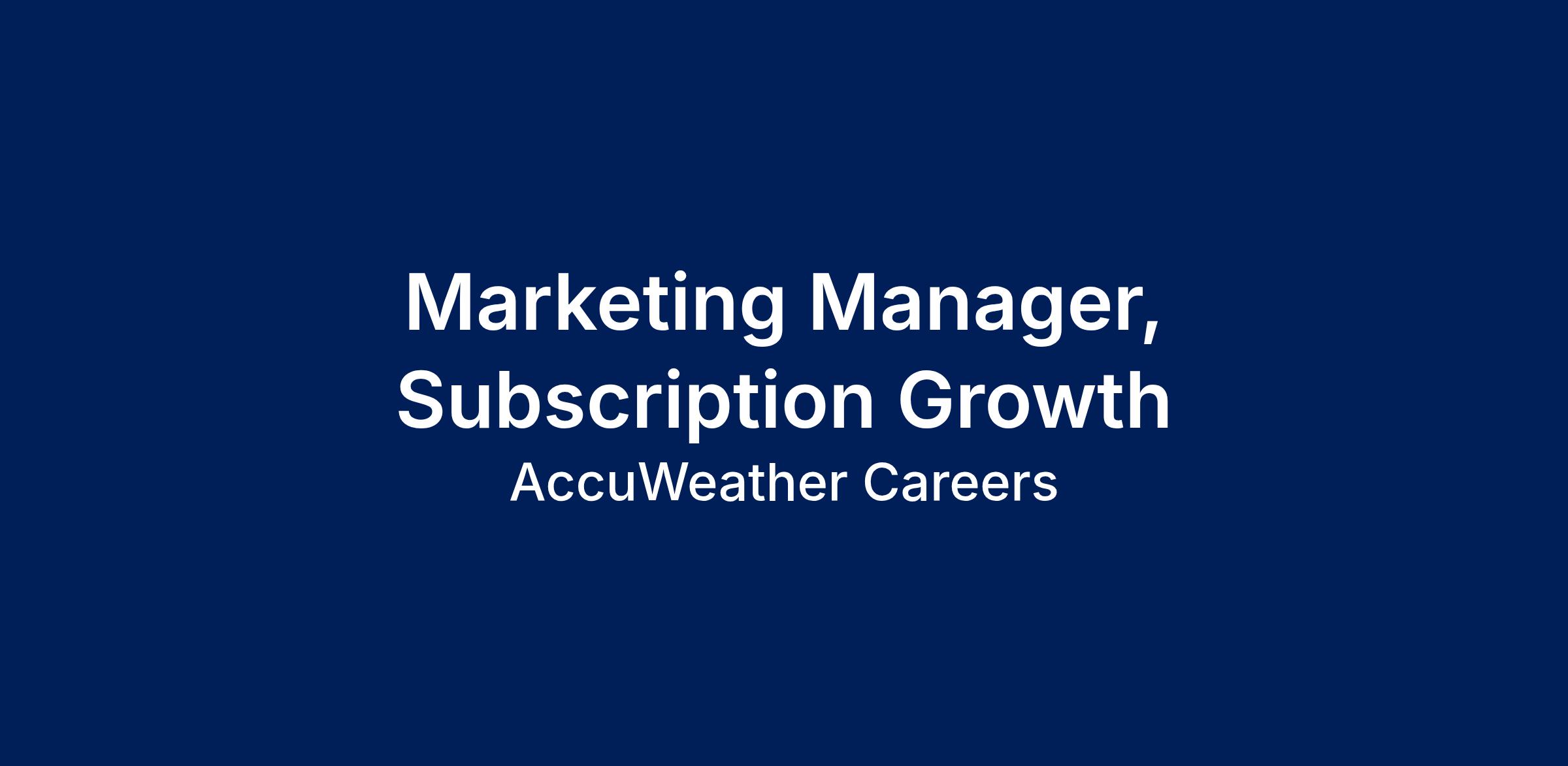 AccuWeather is hiring a Marketing Manager to join its Marketing team. The Marketing Manager, Subscription Growth owns go-to-market execution and ongoing growth strategy for AccuWeather’s consumer subscription business across app and web properties. This role sits on the Marketing team and serves as the primary marketing partner to Product and Consumer Revenue leaders, with responsibility for driving subscription acquisition, conversion, engagement, and lifecycle performance for the Premium+ service, as well as broader app marketing initiatives that improve engagement and app quality signals.