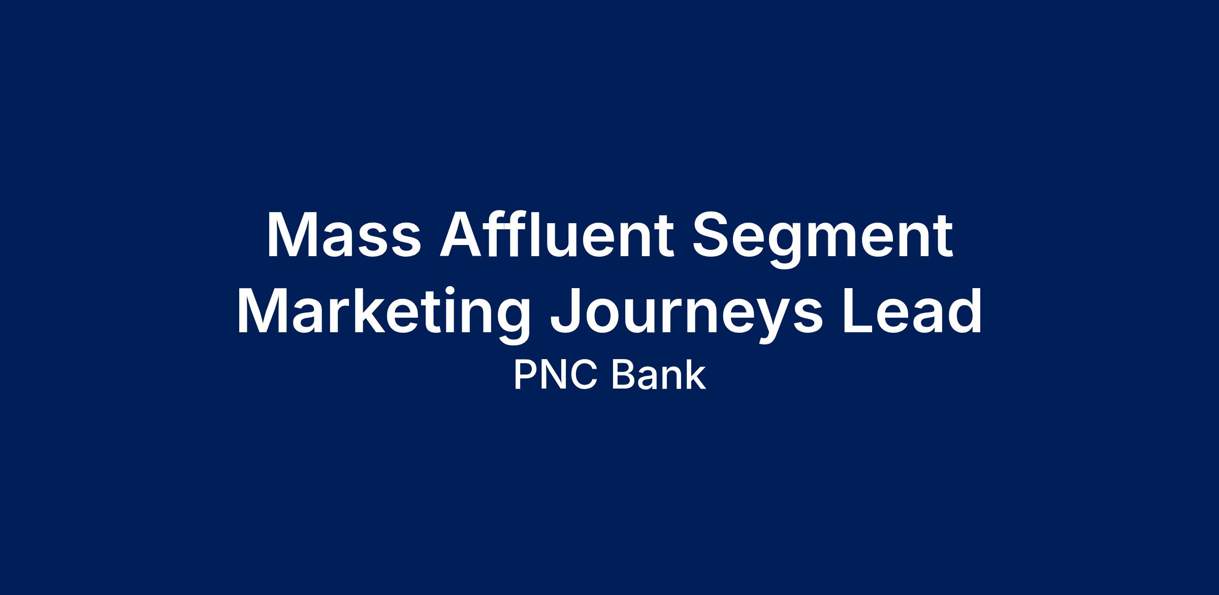 PNC’s Marketing organization is advancing its capabilities to deliver best in class customer experiences and drive growth through data driven, technology enabled marketing. We are seeking an innovative Mass Affluent Segment Marketing & Journeys lead to play a critical role in operationalizing customer and cross sell journeys for our Mass Affluent clients. This role will leverage consumer insights, develop segment specific marketing journeys, and deliver seamless activation across channels. Success in this role will also depend on rigorous measurement and continuous optimization in partnership with Analytics and MarTech teams.
