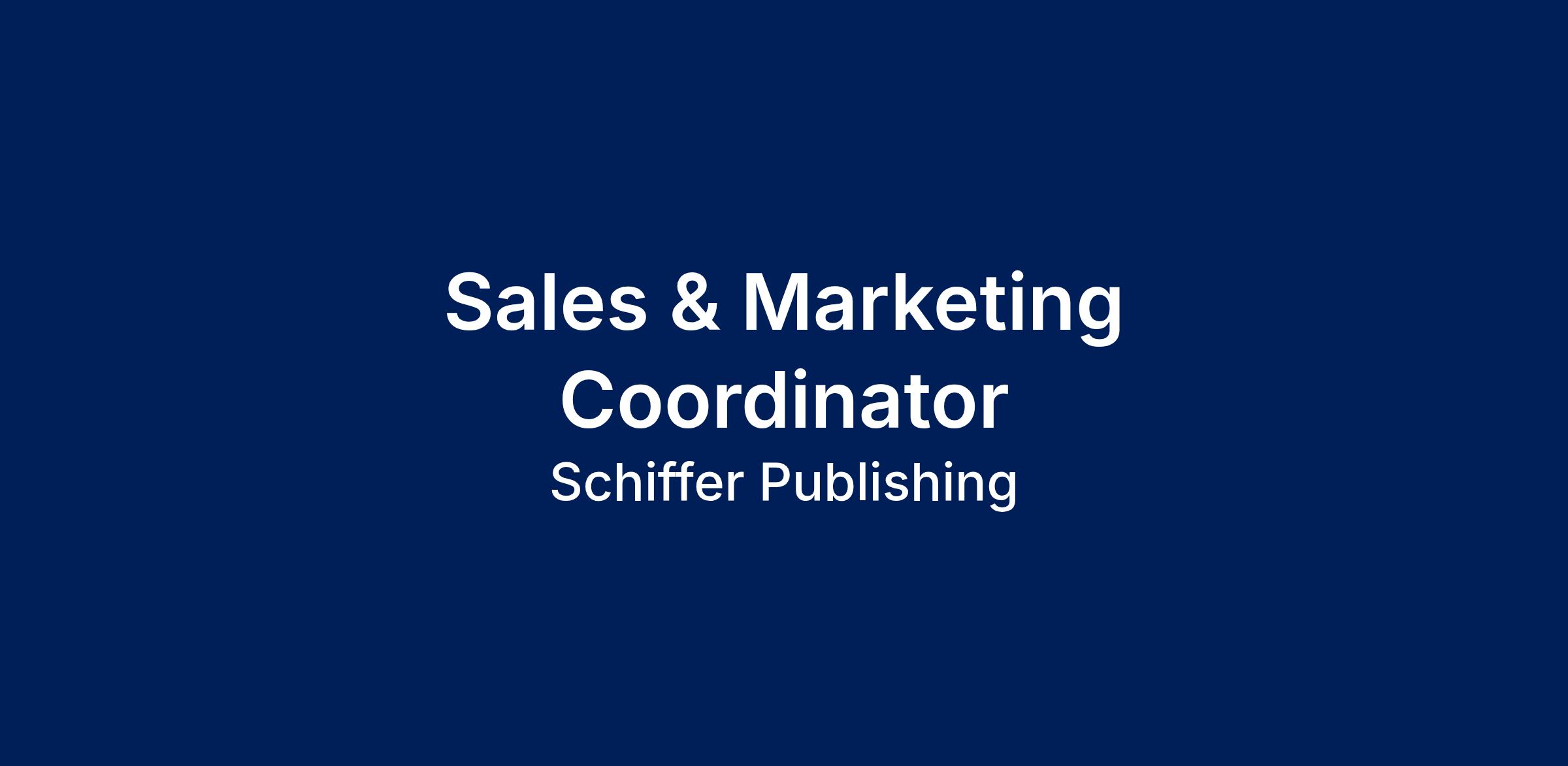 We're looking for a Sales and Marketing Coordinator to support sales initiatives and the development and implementation of creative, tailored marketing and publicity campaigns for our non-fiction titles across all Schiffer imprints. This role reports directly to the Director of Sales and Marketing and supports that role, as well as the title marketers for each Schiffer imprint. This role also requires close collaboration and communication with editorial, design, and sales teams internally, and at times, authors externally.