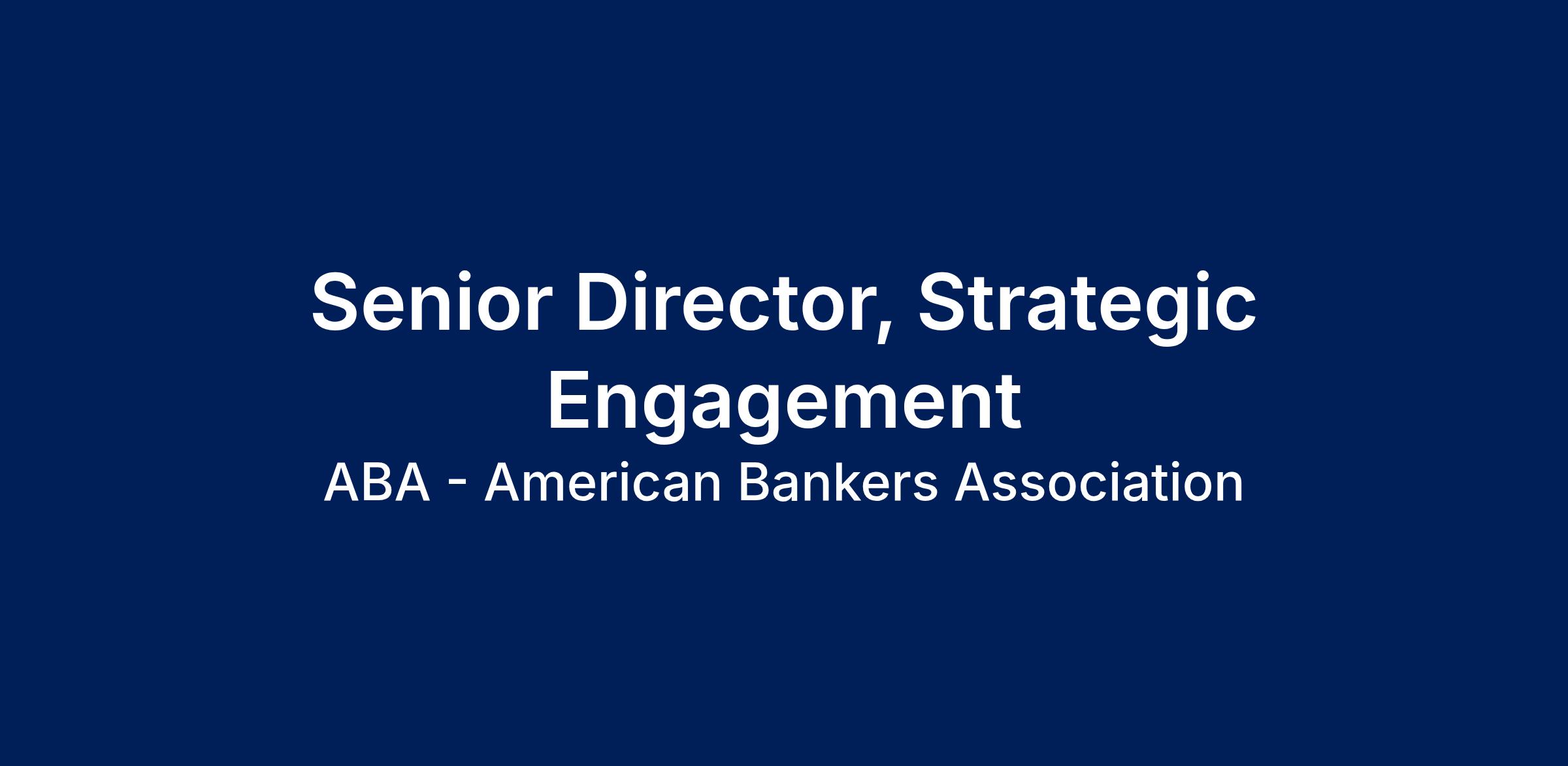 Want to work for a great Organization? The American Bankers Association is the banking industry's champion. Joining ABA makes you part of a team that: • has Extraordinary People - ABA experts are the "go to" sources for bankers, policy makers and the media for credible information and insights for the banking industry. • has Unmatched Scope and Scale - ABA's unparalleled information and services keep members current, knowledgeable and prepared. • is Impact-Driven - ABA has a proven record of bringing about positive change for our members and the industry. We take action and achieve results. Plus competitive pay, an outstanding benefits package, a convenient DC location, a professional collegial work environment and an opportunity to work on issues of national significance equals a winning combination! Click Here to review ABA's holistic approach to Benefits and Total Rewards. Employer of Choice: ABA is recognized with a 2025 Great Company Culture Award and 2025 Great Place to Work designation! Job Description: ABA’s Office of Strategic Engagement (OSE) is seeking an experienced public policy professional to join its advocacy team. OSE supports senior leadership in developing ABA’s policy strategy and messaging, while driving a portfolio of high-priority advocacy campaigns across key areas. The Senior Director of Strategic Engagement will be responsible for managing relationships with external stakeholders and providing accountability for OSE-designated projects. The successful candidate will be a seasoned public policy professional with a deep understanding of the federal and state policymaking process, have a track record of bipartisan coalition-building, and experience supporting issue-based public policy campaigns. The Senior Director will be responsible for day-to-day management of our external relations function, building and maintaining relationships with advocacy groups, state policy organizations, third-party organizations, and other stakeholders. Responsibilities include: Building coalitions and interfacing with external stakeholders: A critical component of ABA's advocacy campaigns involves updating external stakeholders on efforts and partnering on various initiatives. The Senior Director will strengthen relationships with third-party organizations and develop new opportunities for collaboration. Leveraging advocacy infrastructure: ABA has a comprehensive set of advocacy tools that must be efficiently and effectively deployed in pursuit of our policy objectives. As a membership organization, ABA’s priorities are our members’ priorities, so effective communication with our members in each OSE priority area is critical. The Senior Director must ensure key membership constituencies are positioned effectively and supported with the information they need to maximize advocacy impact – both in everyday interactions with policymakers, and at our flagship advocacy events. Crafting compelling advocacy narratives: The Senior Director will work closely with subject matter experts throughout the organization to define and prioritize policy objectives. For key policy priorities, OSE will help facilitate internal deliberations on strategic direction, including the use of data analytics, messaging, coalition building, and member outreach to craft compelling advocacy narratives and achieve objectives. The successful candidate will help create an environment of seamless coordination between ABA departments and drive a cohesive approach to the work product of the organization. Requirements: Bachelor’s degree in government, political science, public policy, or related field preferred or equivalent experience. 10+ years of experience in financial services policy or related areas preferred. 10+ years of working with Congress and/or the Executive Branch preferred. 10+ years of experience working with senior executives. Large, active personal network within the policy and financial services communities. Significant experience meeting/exceeding performance goals. Experience supporting successful policy issue advocacy campaigns with a focus on collaboration and problem-solving. Ability to successfully take ownership and initiative in a fast-paced, tight-knit environment where flexibility, organization, and teamwork are essential. Strong project management skills to ensure the timely execution of complex action plans. Excellent communication skills, both verbal and written. Membership organization experience preferred. Familiarity with financial services issues strongly preferred. Knowledge of advocacy strategies and tactics is strongly preferred. Experience with strategic communications preferred. Exceptional interpersonal, communication, and management skills. Ability to travel (20 – 50%). Target range for role: $165,000.00 - $175,000.00 Salary Band Range: $129,220.00 - $178,930.00 - $228,640.00 American Bankers Association (ABA) is an Equal Opportunity employer. All qualified applicants will receive consideration for employment without regard to race, religion, color, national origin, age, sex, marital status, gender identity, sexual orientation, disability, protected Veteran status, personal appearance, political affiliation, family responsibilities, or any other characteristic protected by applicable law. The American Bankers Association is the voice of America’s banks—the small, midsize, regional and large banks that together employ more than 2 million women and men and help drive America's economy. Please join us and become a part of a rapidly transforming industry that drives growth and innovation at home and around the world.