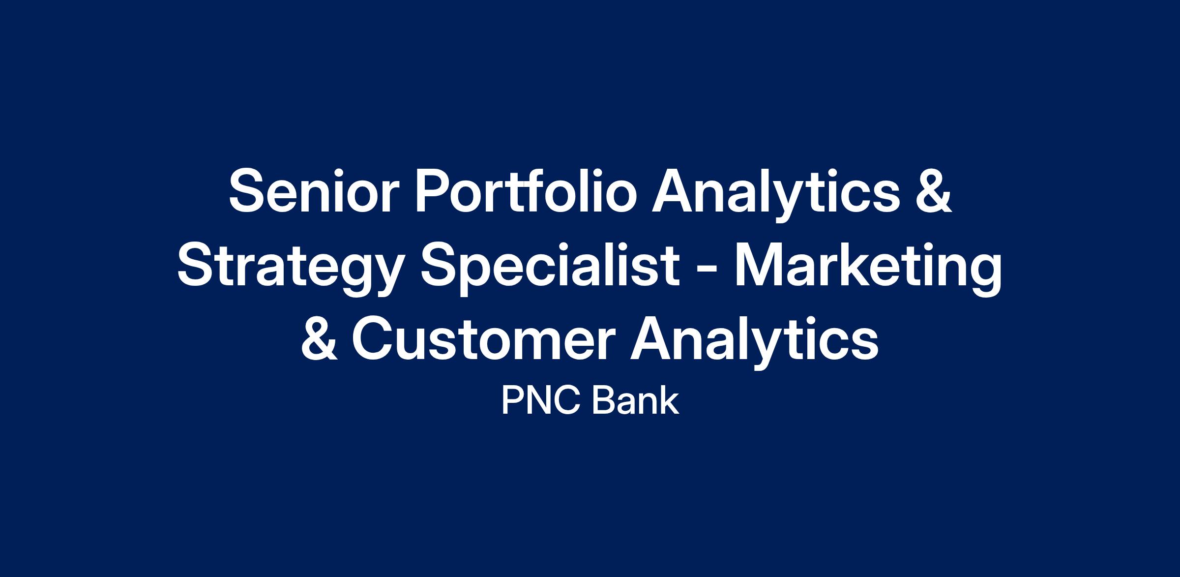 At PNC, our people are our greatest differentiator and competitive advantage in the markets we serve. We are all united in delivering the best experience for our customers. We work together each day to foster an inclusive workplace culture where all of our employees feel respected, valued and have an opportunity to contribute to the company’s success. As a Senior Portfolio Analytics & Strategy Specialist Senior within PNC's Balance Sheet Analytics & Modeling Marketing & Customer Analytics organization, you will be based in Pittsburgh, PA or Tyson's Corner or Vienna, VA. This position is primarily based in a PNC location. Responsibilities require time in the office or in the field on a regular basis.