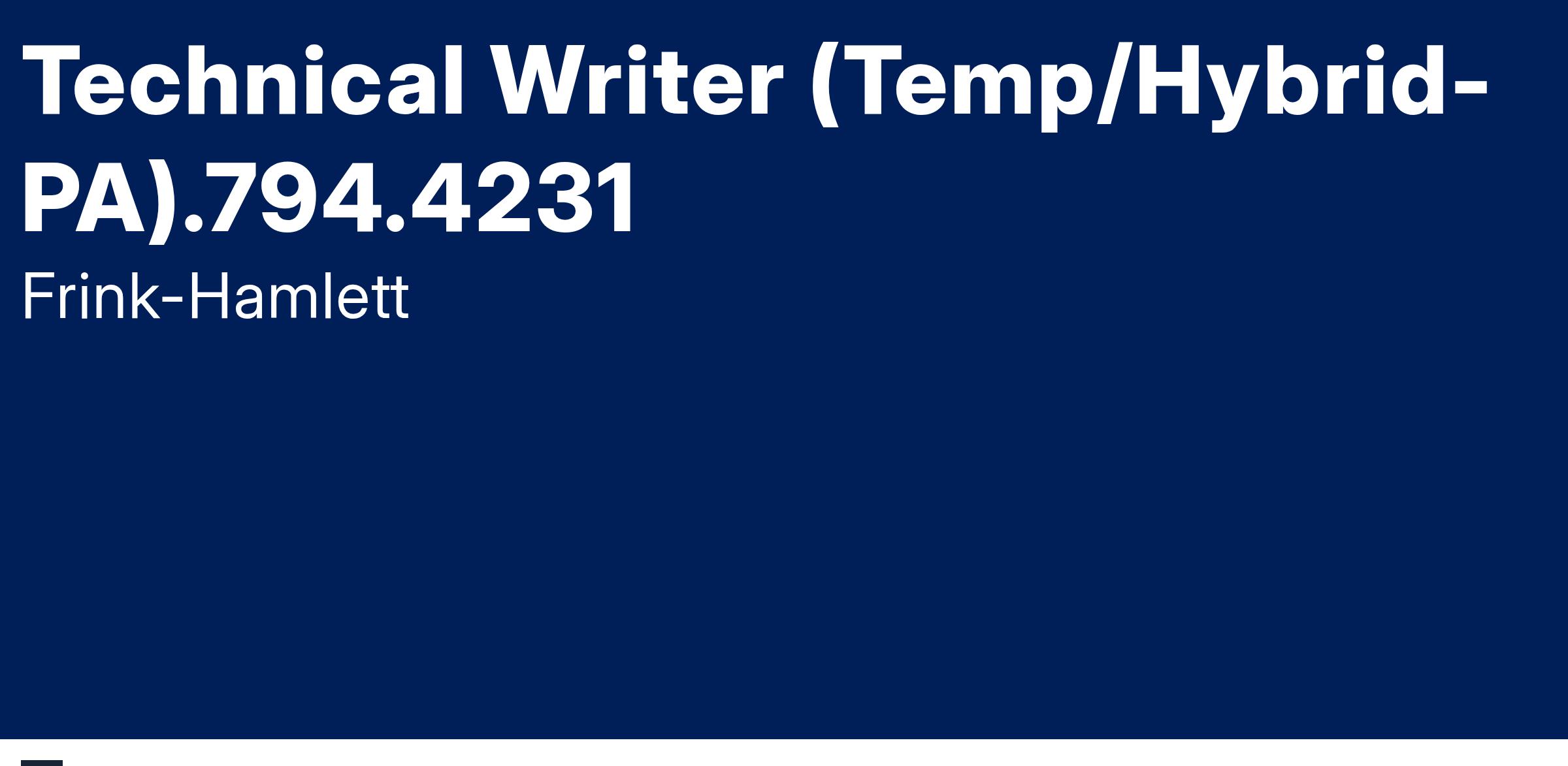 A preeminent global pharmaceutical corporation seeks a Technical Writer on a long-term, temporary basis for at least twelve months, possibly longer in Exton, PA. The schedule is Monday - Friday, 8:00 a.m. - 5:00 p.m. and is hybrid, two - three days per week and may be subject to change. The hourly rate is $30 - $40, plus benefits.